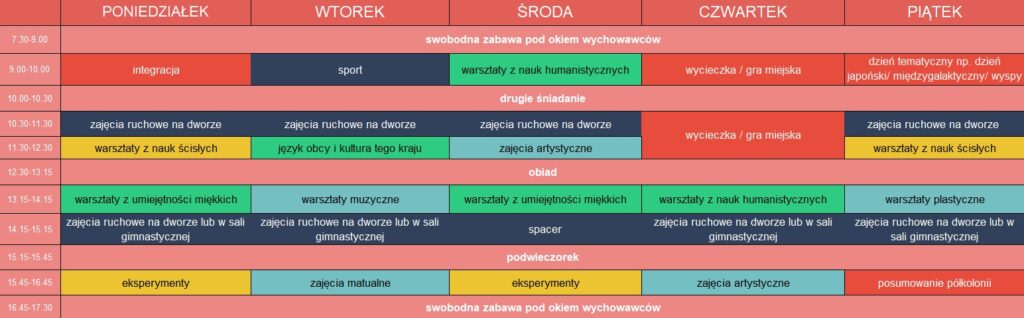 Każdy tydzień to nowy zestaw zajęć, dzięki czemu dzieci mogą uczestniczyć w kilku turnusach bez obaw o powtarzalność. W programie m.in.: